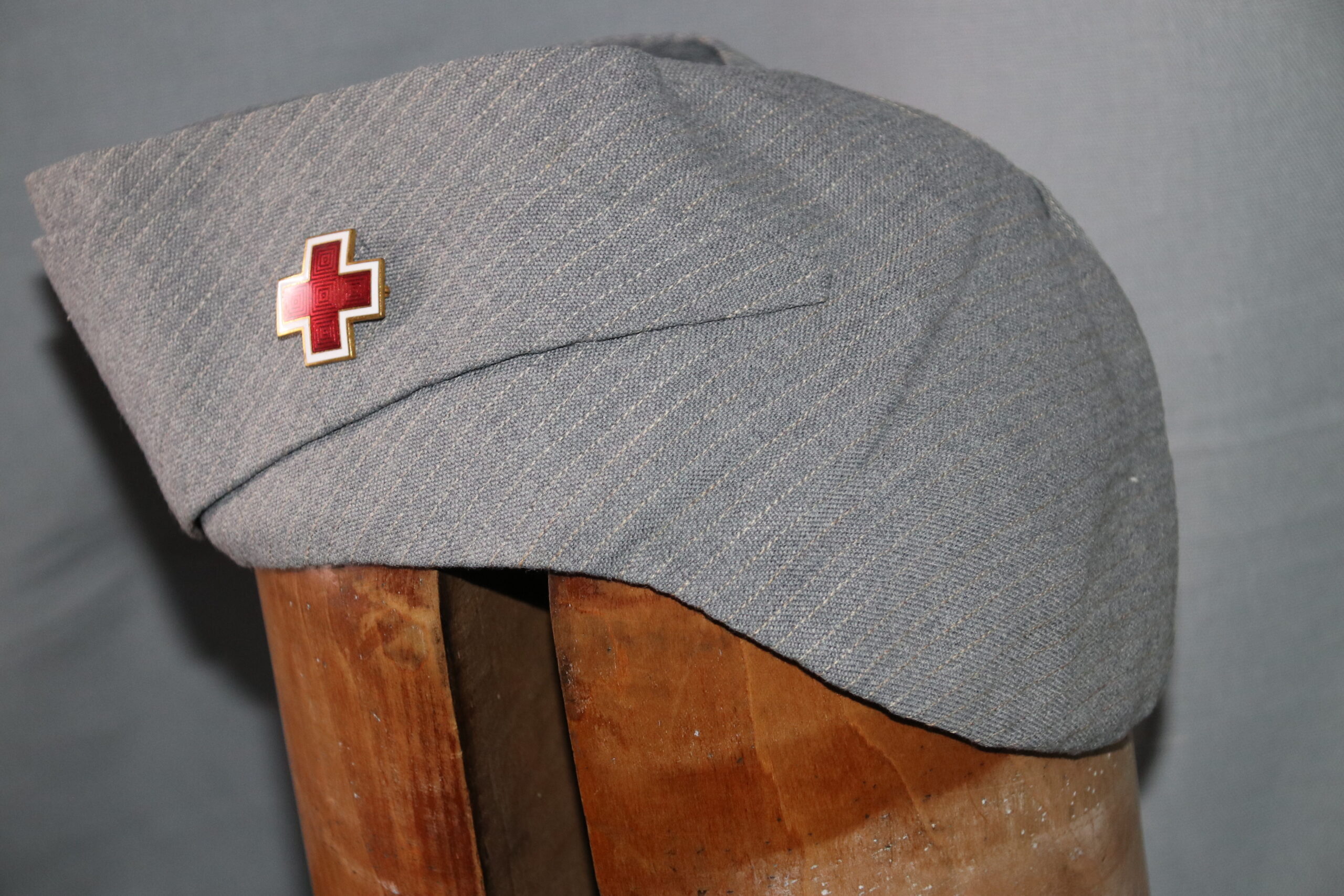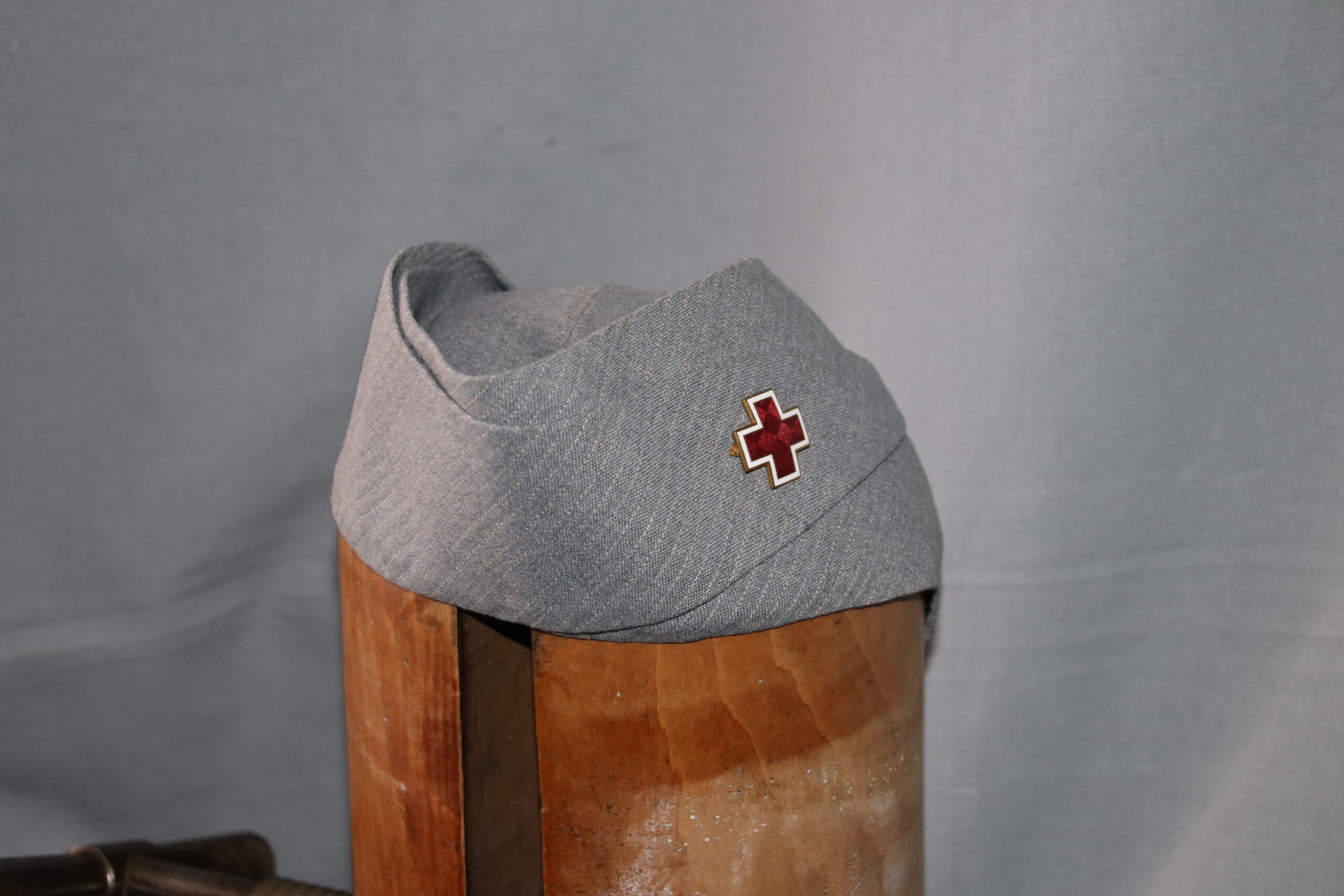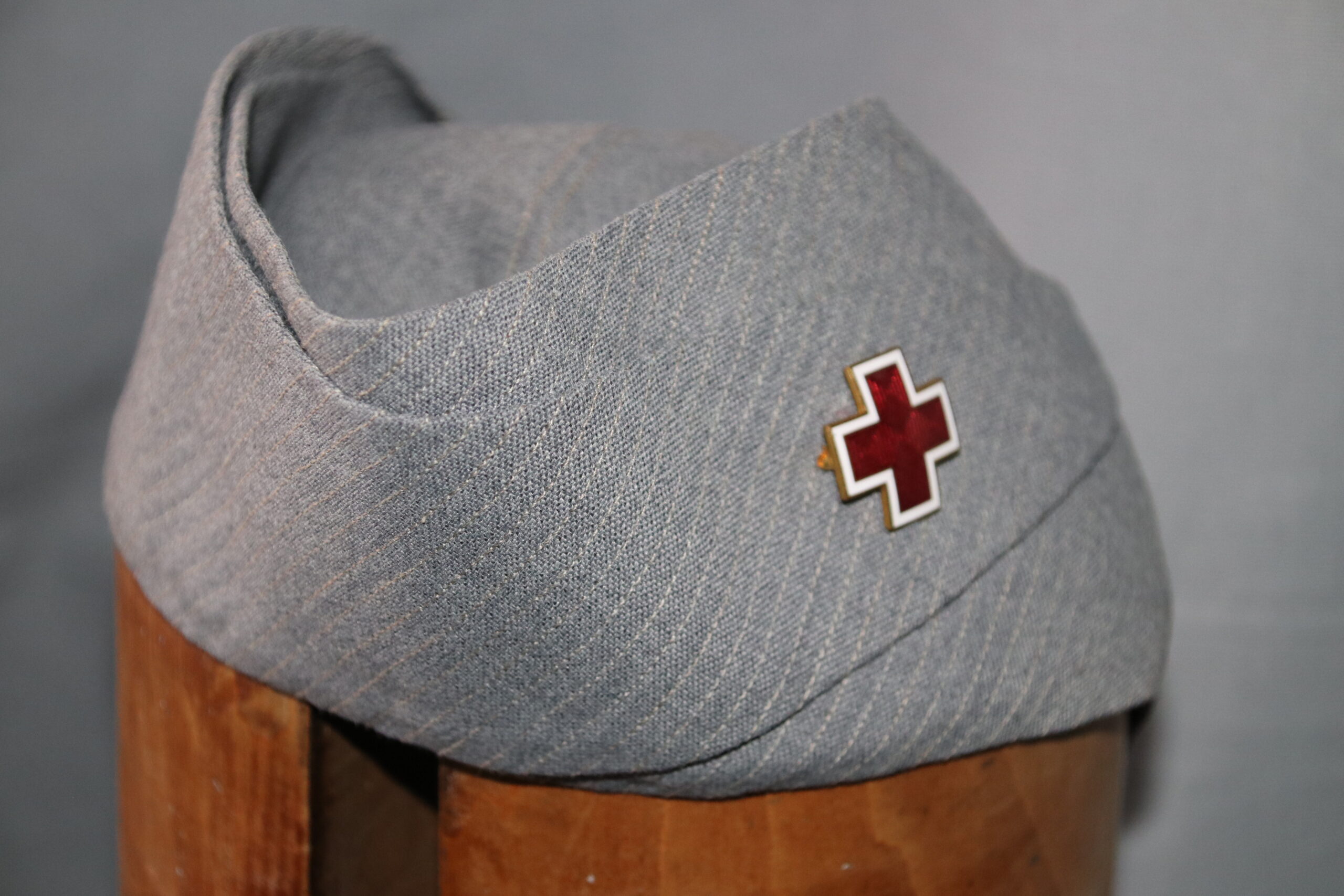 ORIGINAL WW2 ARC AMERICAN RED CROSS PALM BEACH STYLE LIGHT GREY CAP WITH NON MARKED ENAMEL PIN