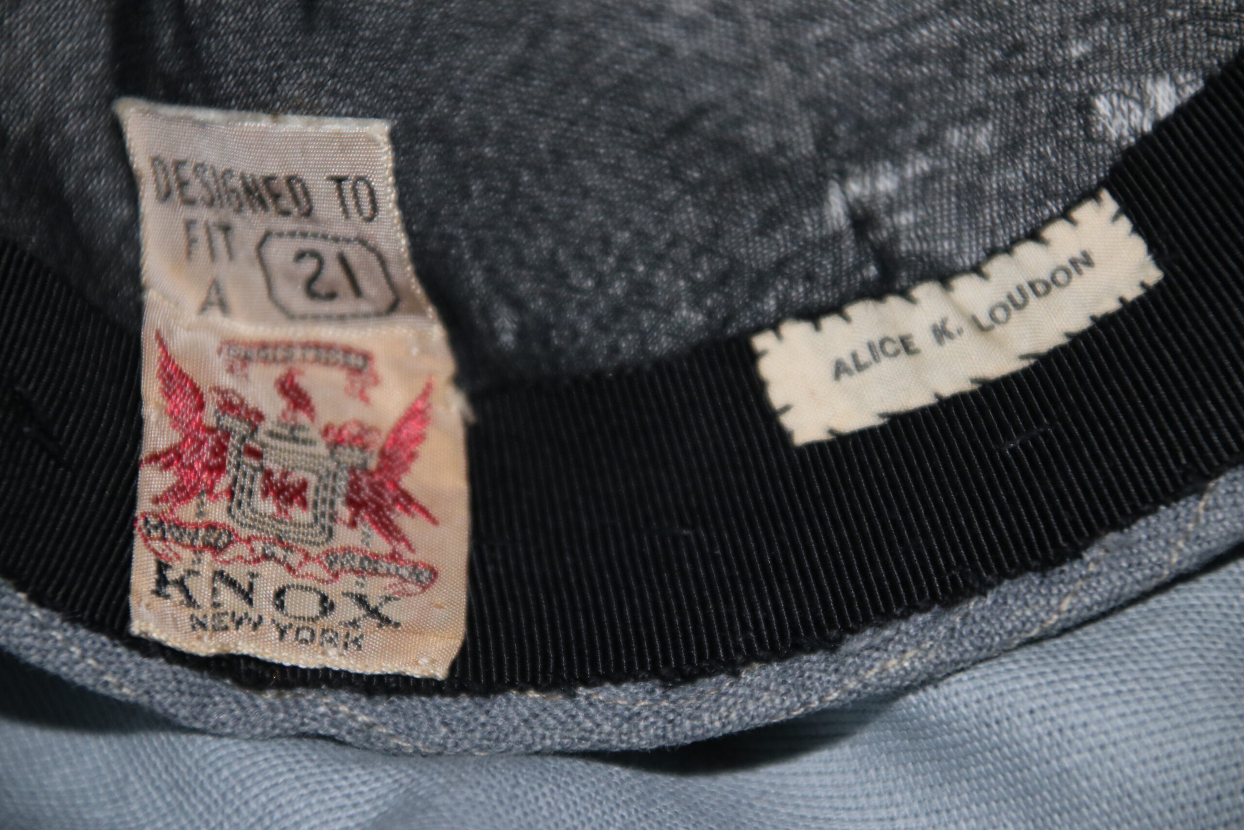 GOOD KNOX MANUFACTURERS LABEL AND ORIGINAL OWNERS NAME TAG ALICE K LOUDON