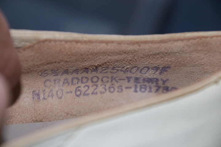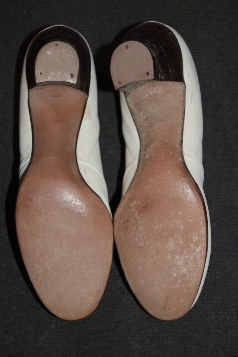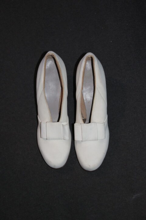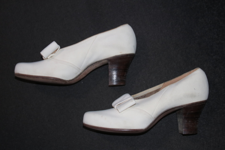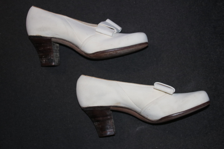 US AMERICAN NURSE WHITE BOW PUMP SHOES, WITH BROWN HEEL. MADE BY CRADDOCK TERRY.