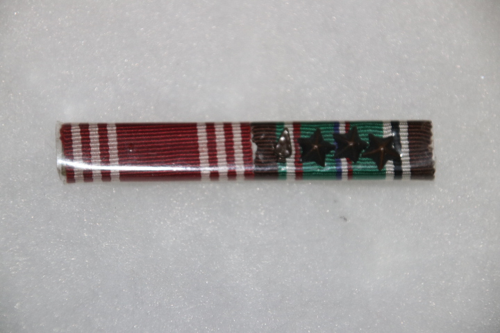 SUPERB ORIGINAL WW2 US ARMY MEDAL RIBBON GOOD CONDUCT, EUROPEAN CAMPAIGN WITH INVASION ARROW HEAD AND THREE STARS WOLF – BROWN MANUFACTURE WITH USUAL PLASTIC COVERING